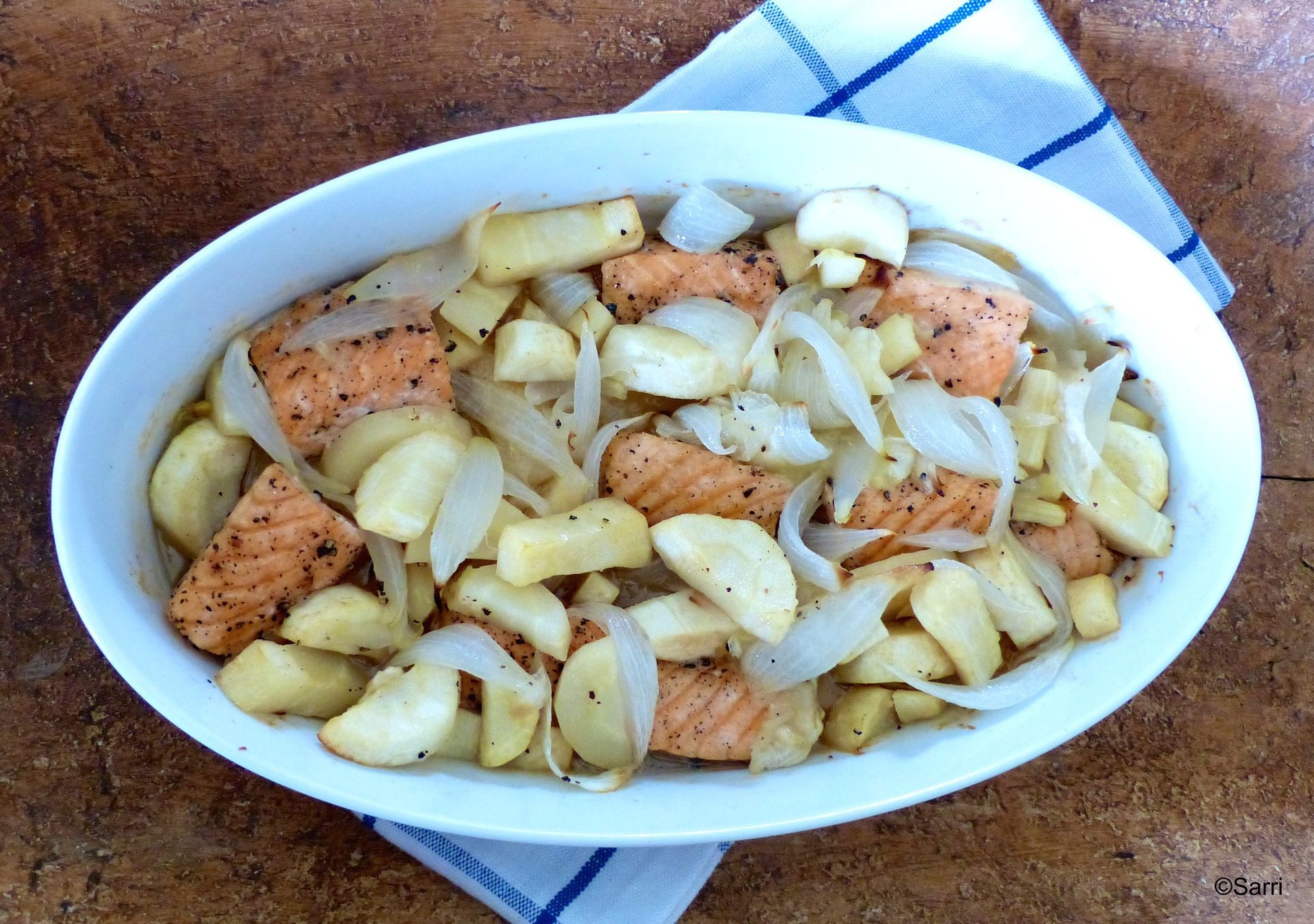 Leikkaa kalat tulitikkuaskin kokoisiksi paloiksi ja pyöritä ne suola/pippuriseoksessa. Anna vetäytyä. Siirrä omena-, sipuli- ja palsternakkapalat uunivuokaan. Sekoita.