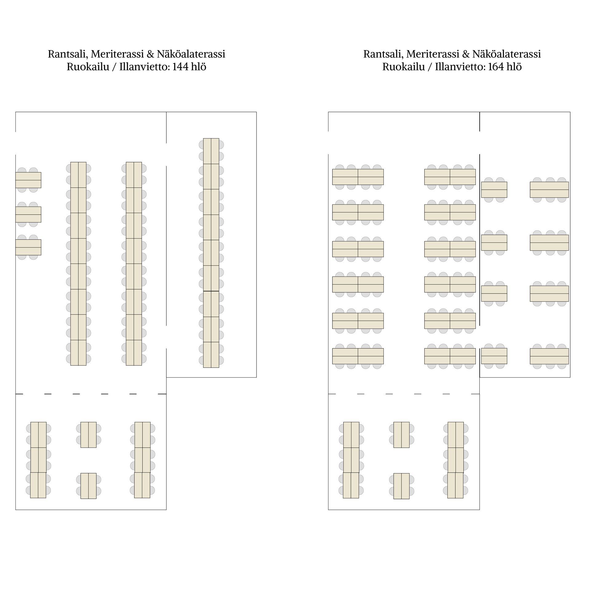Rantsali, Meriterassi ja Näköalaterassi voidaan yhdistää – tuloksena juhlatila yli 140 hengelle.