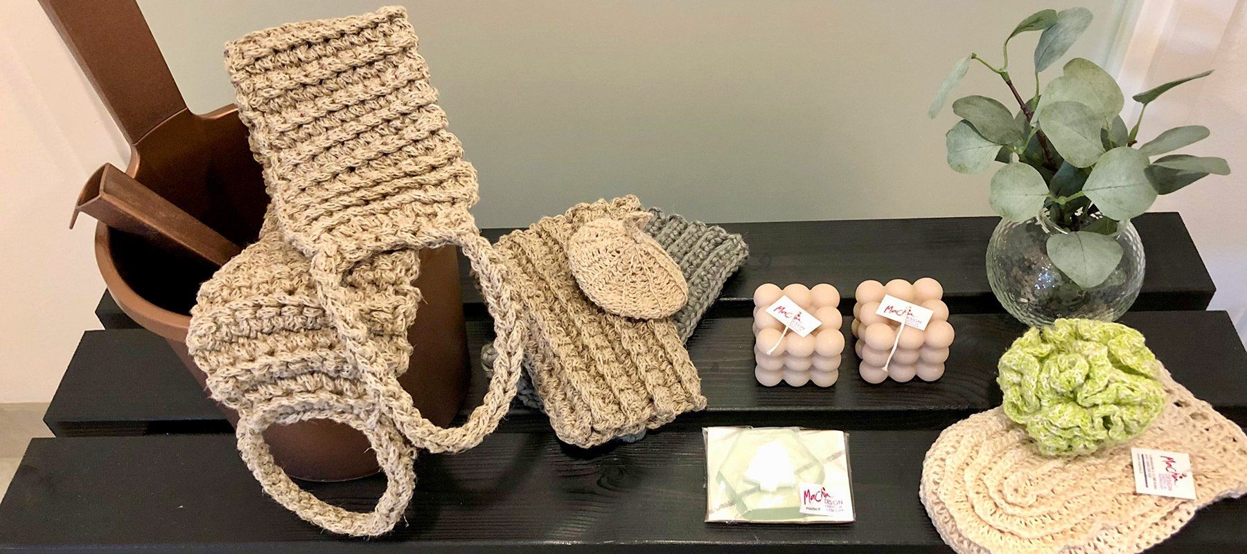 Saunatuotepajalla voit valmistaa virkkaamalla pellava, puuvilla ja bambulangasta seuraavia tuotteita; selänpesin, pesukinnas, pesu-tawashi, pesupyörre sekä puhdistuslappuja. Tuotteet ovat helppoja ja nopeita valmistaa.